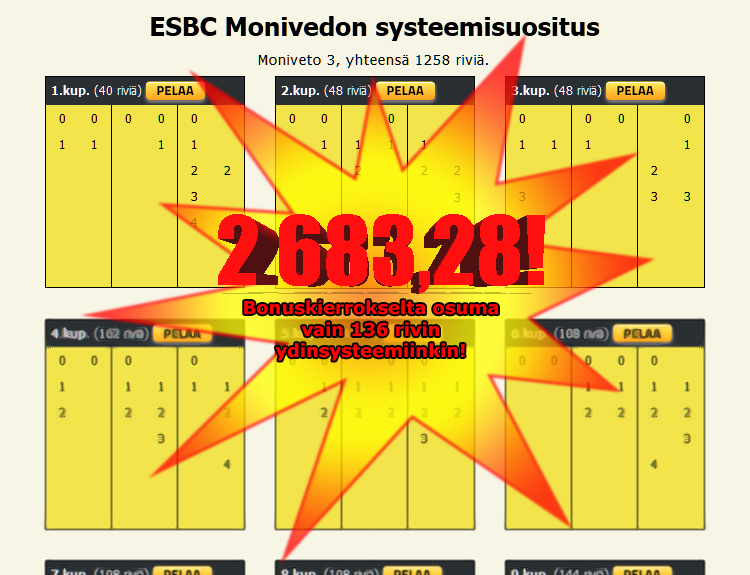 Tänään on erinomainen paikka hakea putkelle jatkoa kun Veikkaus jakaa taas 30 000 € lisärahaa! Lisätyn rahan myötä peli on selvästi tavallista edullisempi ja kannattaa tehdä laajempi peli sekä kertaistaa parhaita rivejä normaalia enemmän. Tämä on huomioitu myös ESBC Monivetolinjalla, jossa 12 kuponkia ja runsaammin rivejä.